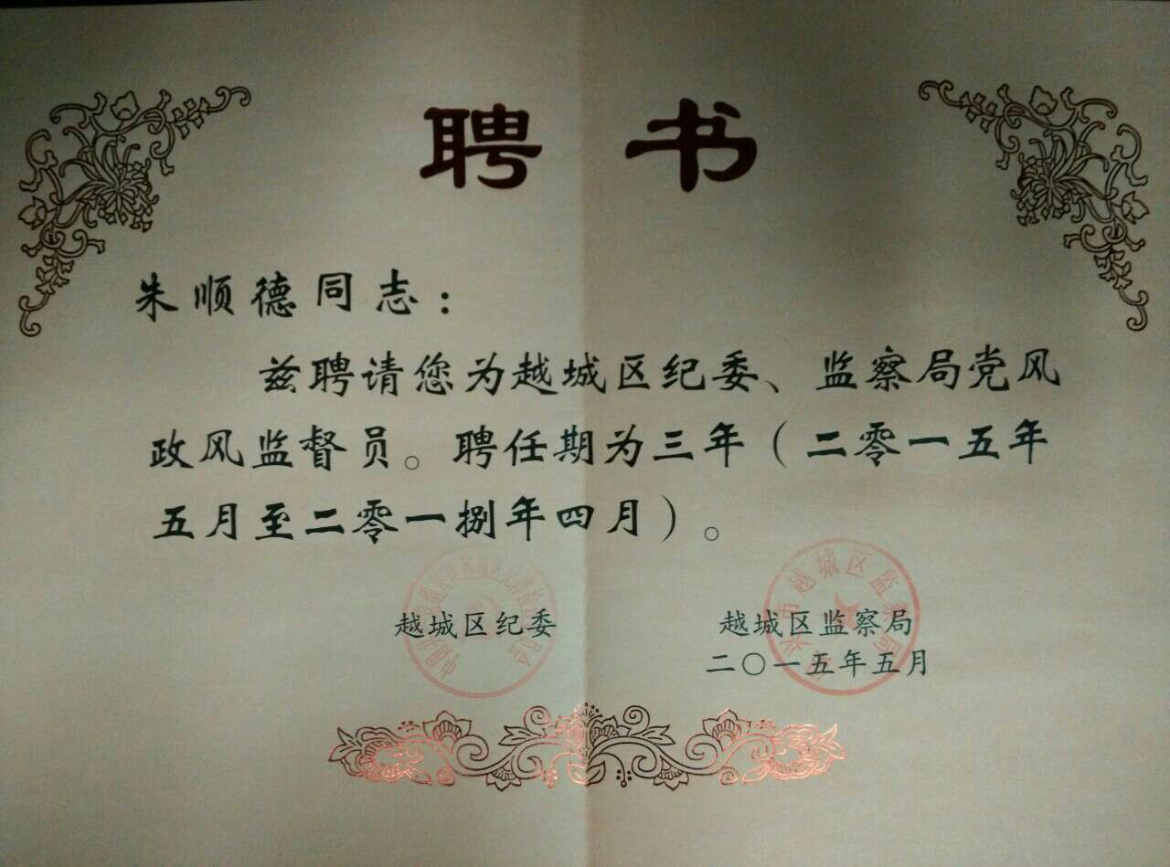 日前,绍兴市政协委员、浙江中圣律师事务所主任朱顺德律师被中共绍兴市越城区纪委、绍兴市越城区监察局聘请为区级党风政风监督员,并任党风政风监督员工作组组长。这是朱顺德律师自2001年受聘为党风政风监督员后再度受聘。 朱顺德律师将认真履行党风政风监督员职责,正确处理好本职工作与兼任监督员工作的关系,积极参加越城区组织的党风政风监督检查活动,为不断推进越城区党风政风建设作出贡献。